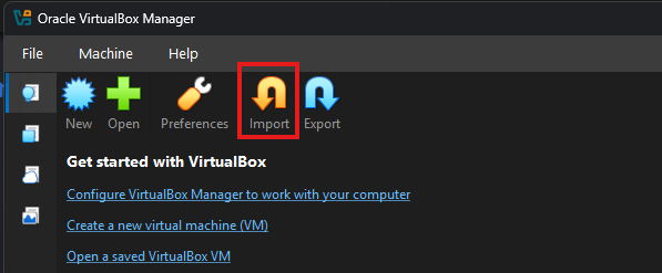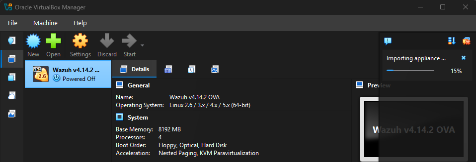 Once I had all the dependencies installed and VirtualBox launched, it was time to import the OVA file from Wuzah. What is an OVA, you might be asking? An OVA is just a fancy archive for virtual machines that contain all the necessary configurations for the services we want. Imagine somebody already did the installation and basic configurations before handing it over to us and you'll have a pretty good idea why OVAs are preferred in situations like this.