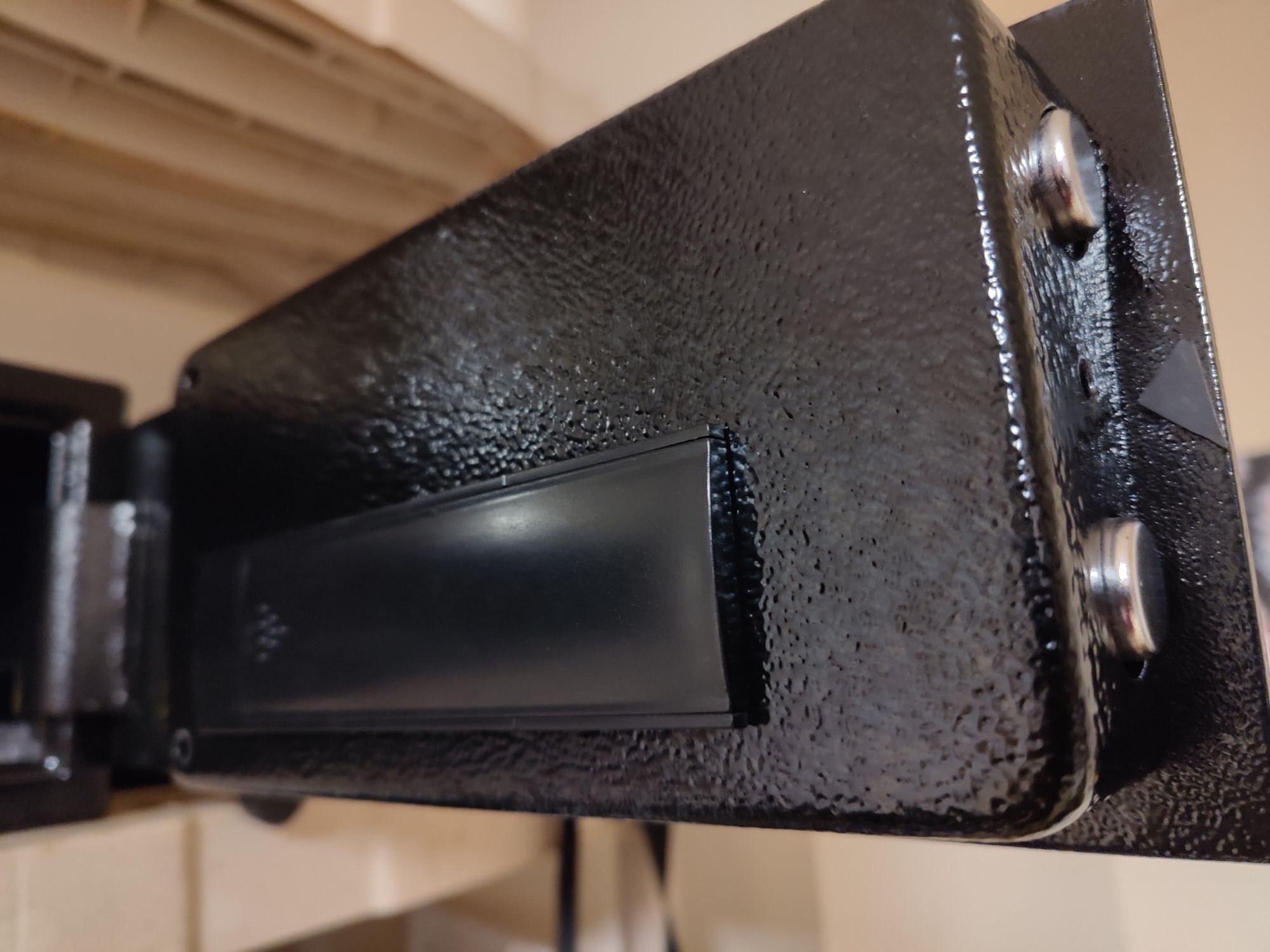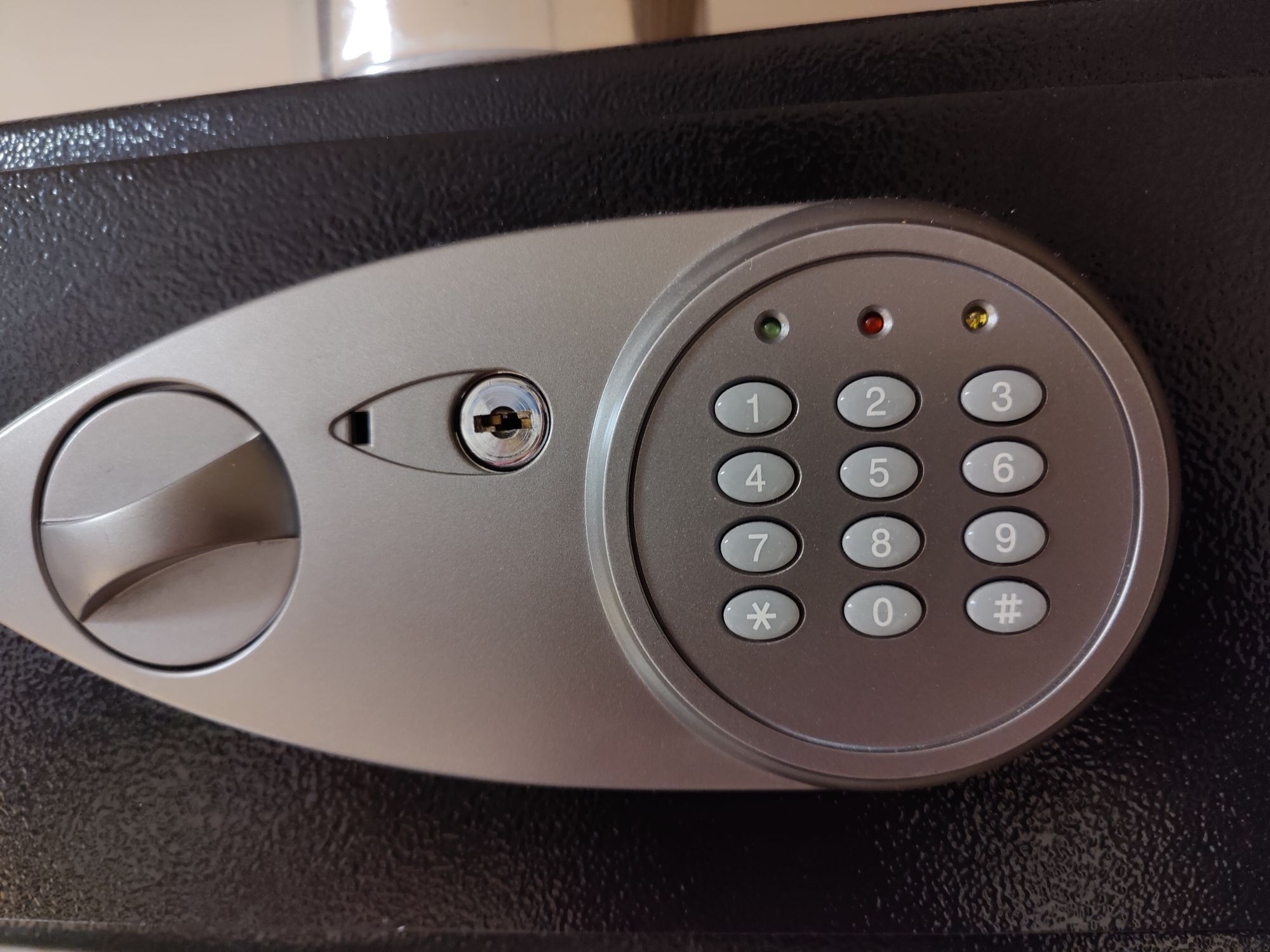I received this floor safe a long time ago. It's really not much to speak of, but I see similar on the shelves all the time for non-insulated security. While scrolling through a certain video streaming service one day I found several examples of a simple exploit to bypass this very safe. It was such a silly sounding hack I naturally had to verify it was possible on mine, and found it certainly was. Since I didn't discover the vulnerability, I'll simply describe it with some images below, then move on to mitigation.