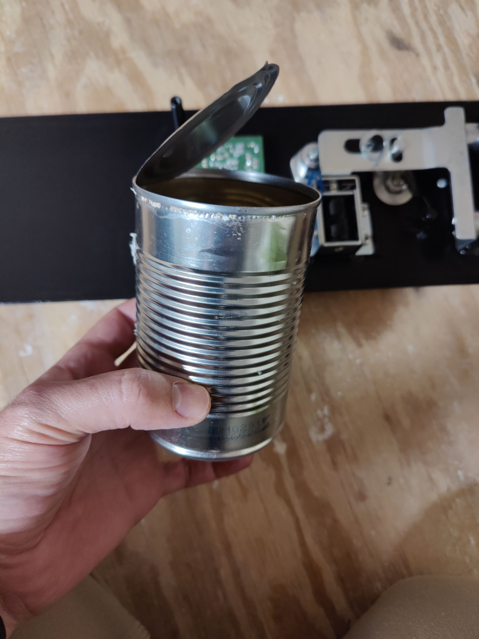 First, let's get a metal soup can. Cans are great for metal work as they readily available and can be used a few different ways. This one we're going to cut down to size so that it fits over the entire circuit board. The wires conduct electricity to the solenoid so there isn't any issue with radio frequency interference once it's cut down to size.