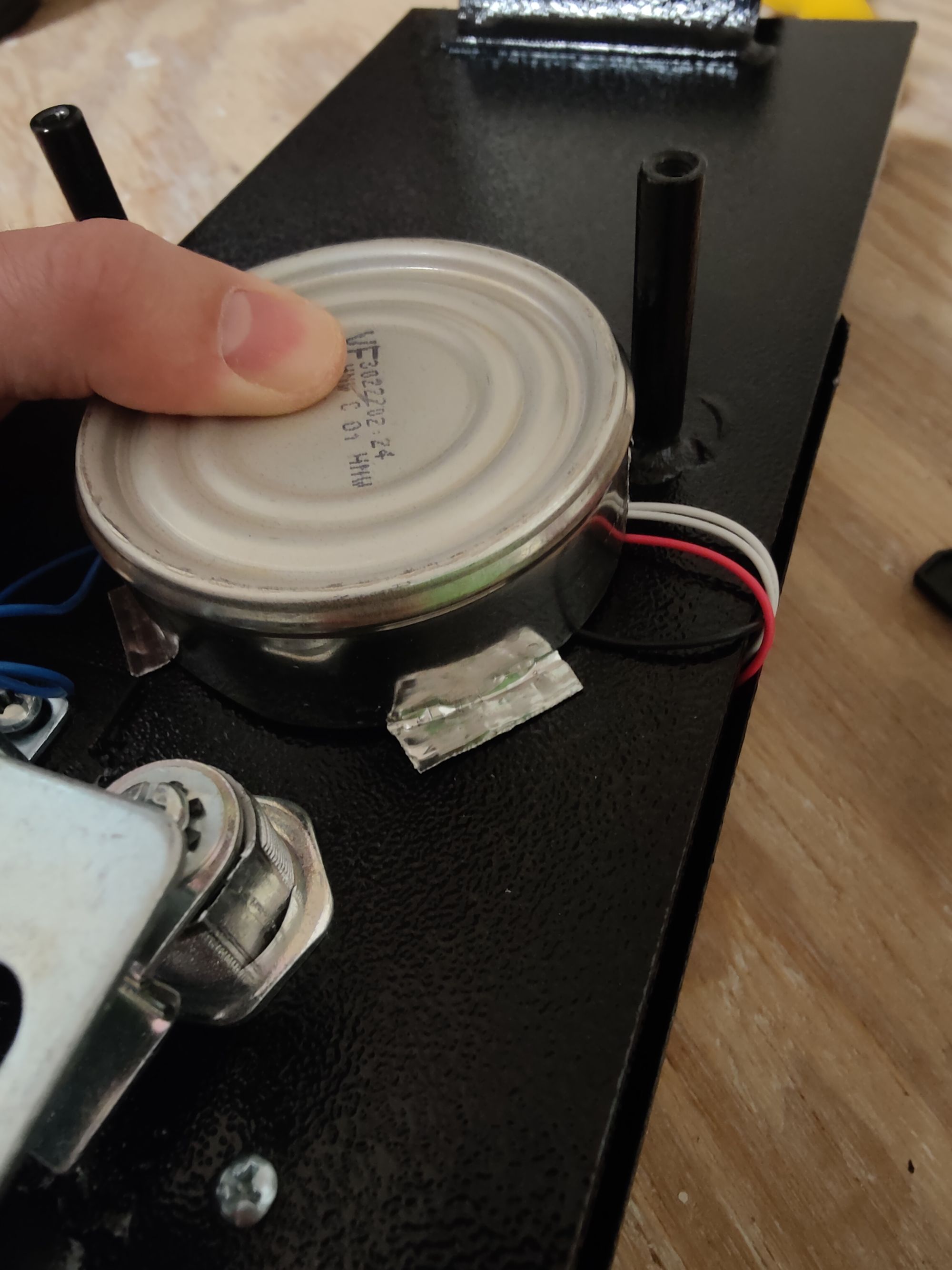 Using tin snips, I cut off the excess can and fashioned a few feet that could be bent out and used as mount points. These can be glued to the back of the safe. I used a glue-gun, but one could also use silicon or JB-Weld just as well. Be mindful of gravity though and make sure if you use a long setting glue to orient the safe to avoid it sliding down. Again, it just needs to be strong enough to baffle an attempt to push in the LED and attack the solenoid using something like a coat hanger.